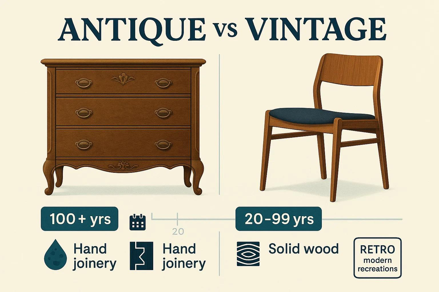 - Vintage = 20–99 years; era-defining styles, often mass-produced, budget-friendlier